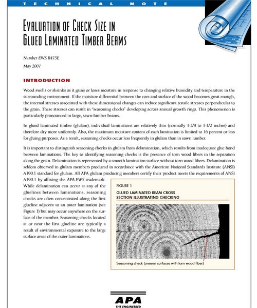 APA EWS R475E EVALUATION OF CHECK SIZE IN GLUED LAMINATED TIMBER BEAMS