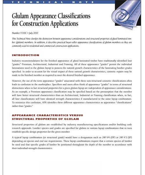 APA Y110C GLULAM APPEARANCE CLASSIFICATIONS FOR CONSTRUCTION APPLICATIONS