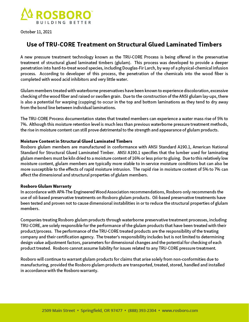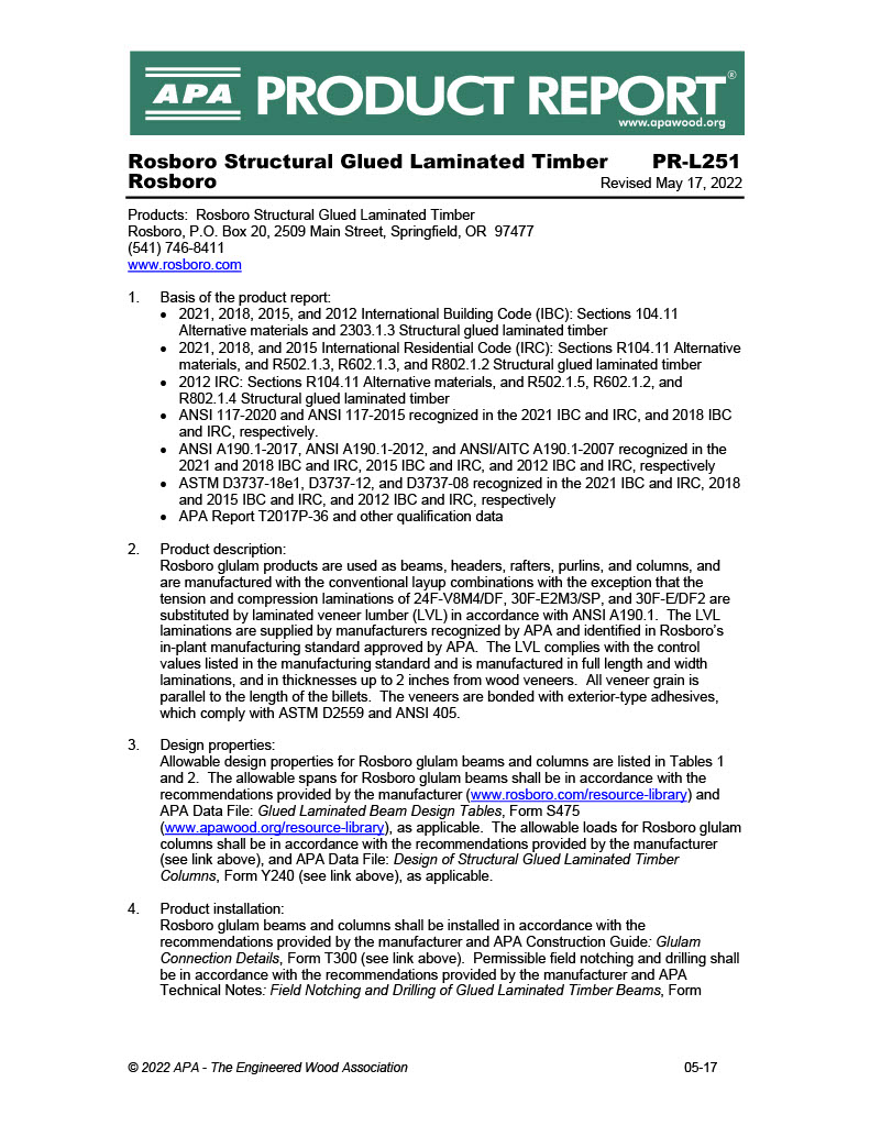 PR-L251D: APA PRODUCT REPORT FOR ROSBORO STRUCTURAL GLUED LAMINATED TIMBER