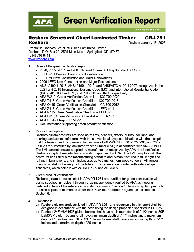 GR-L251: APA GREEN VERIFICATION REPORT FOR ROSBORO GLULAM