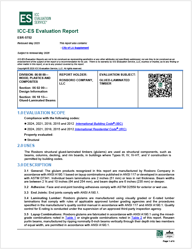 ESR-5752: ICC-ES EVALUATION REPORT FOR ROSBORO STRUCTURAL GLUED LAMINATED TIMBER